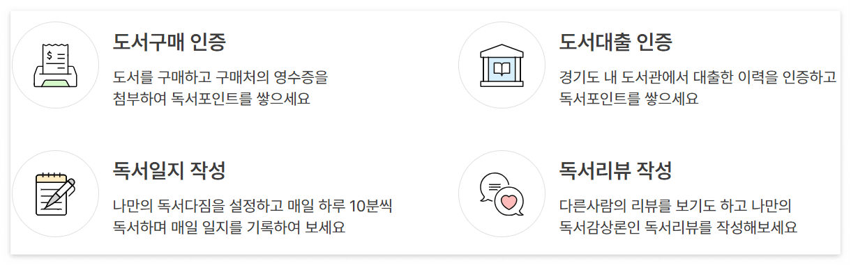- 도서관 대출 인증: 경기도 내 공공도서관 대출 기록 사진 업로드(종이책 월 2권, 전자책 월 1권 인정)