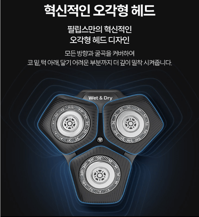 - 회전형 헤드: 3개의 회전 헤드가 얼굴에 부드럽게 밀착되어 구석진 부위도 편하게 면도 가능